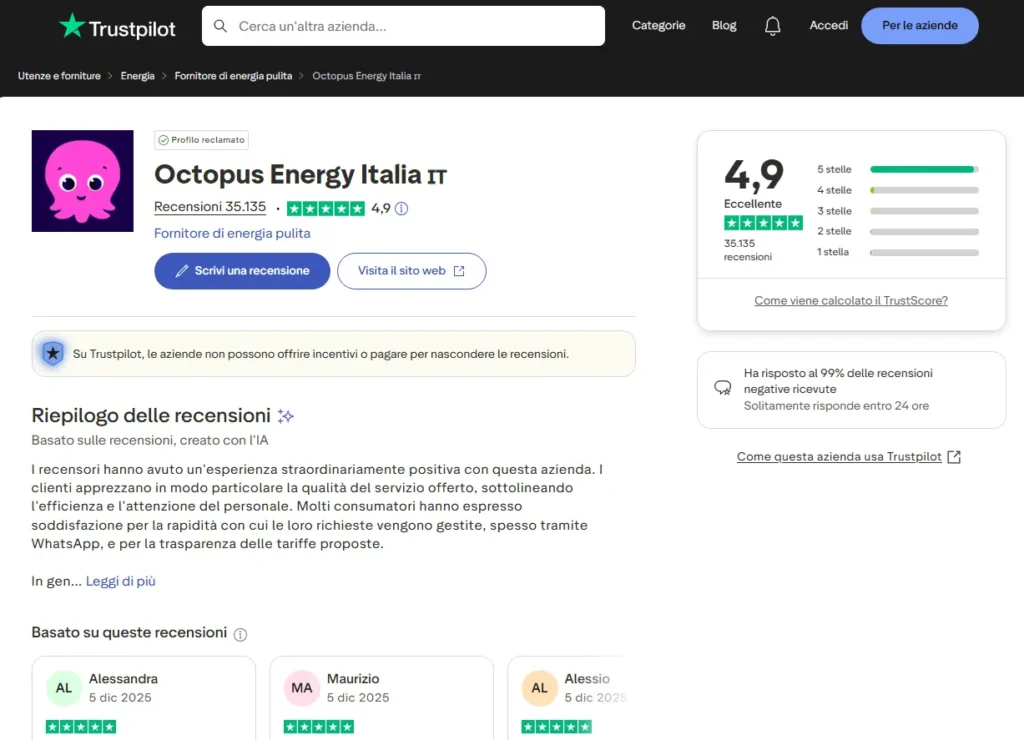 Su Trustpilot, Octopus Energy Italia ha: